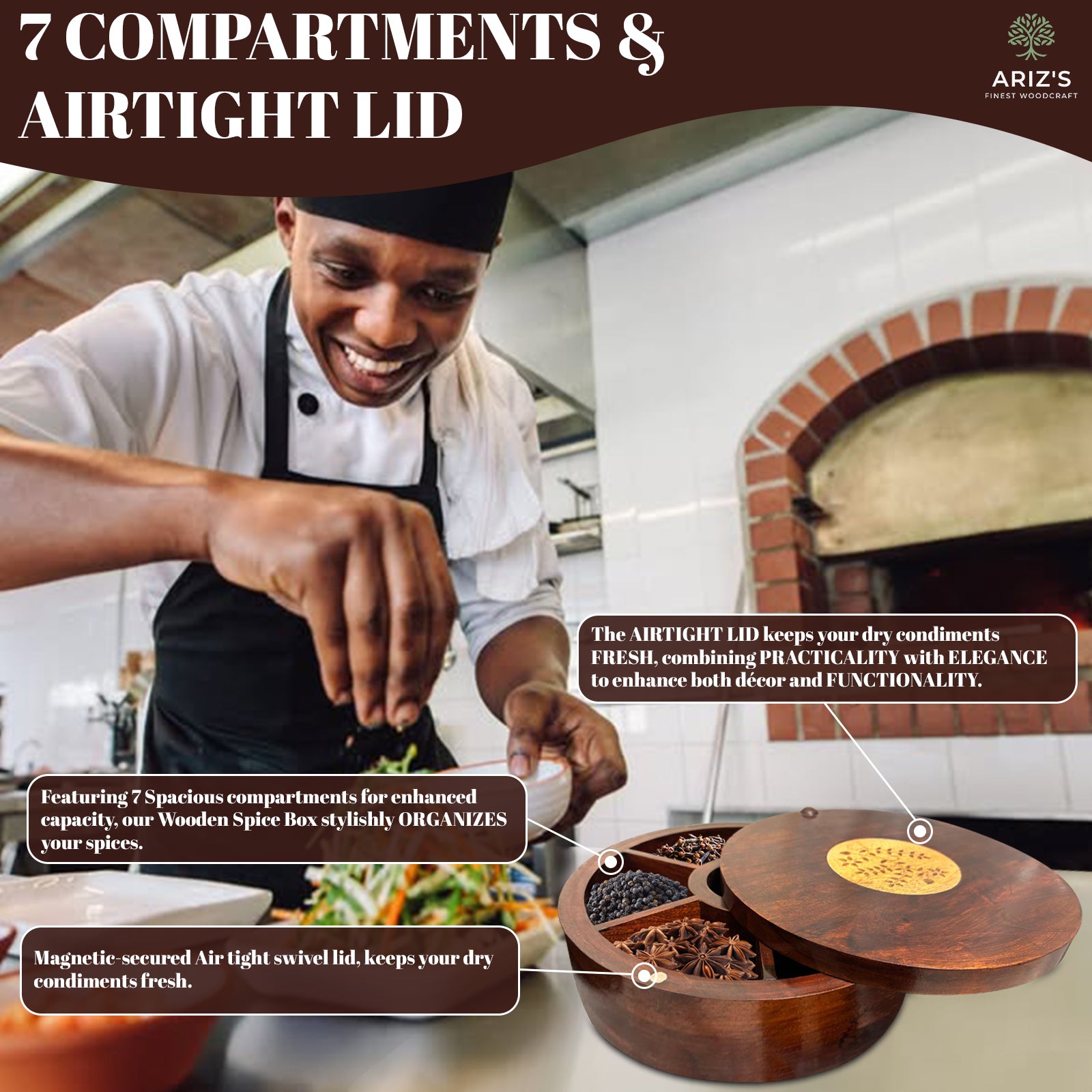 7 COMPARTMENTS & AIRTIGHT LID: Featuring 7 Spacious compartment for enhanced capacity, our Wooden Spice Box stylishly ORGANIZES your spices. The AIRTIGHT LID keeps your dry condiments FRESH, combining PRACTICALITY with ELEGANCE to enhance both décor and FUNCTIONALITY