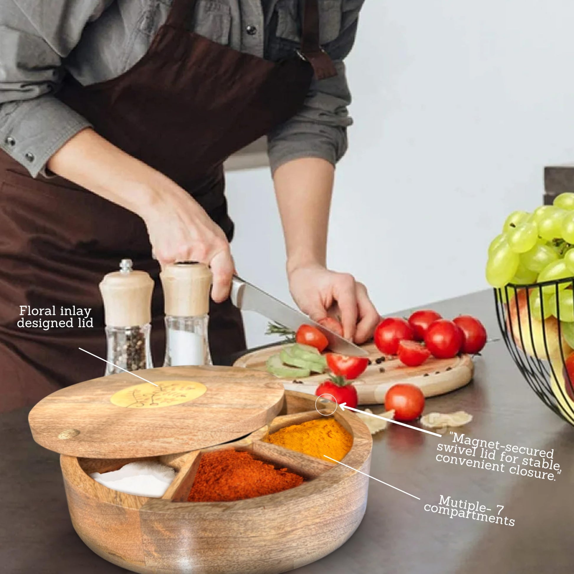 - 7 COMPARTMENTS & AIRTIGHT LID: Featuring 7 Spacious compartment for enhanced capacity, our Wooden Spice Box stylishly ORGANIZES your spices. The AIRTIGHT LID keeps your dry condiments FRESH, combining PRACTICALITY with ELEGANCE to enhance both décor and FUNCTIONALITY